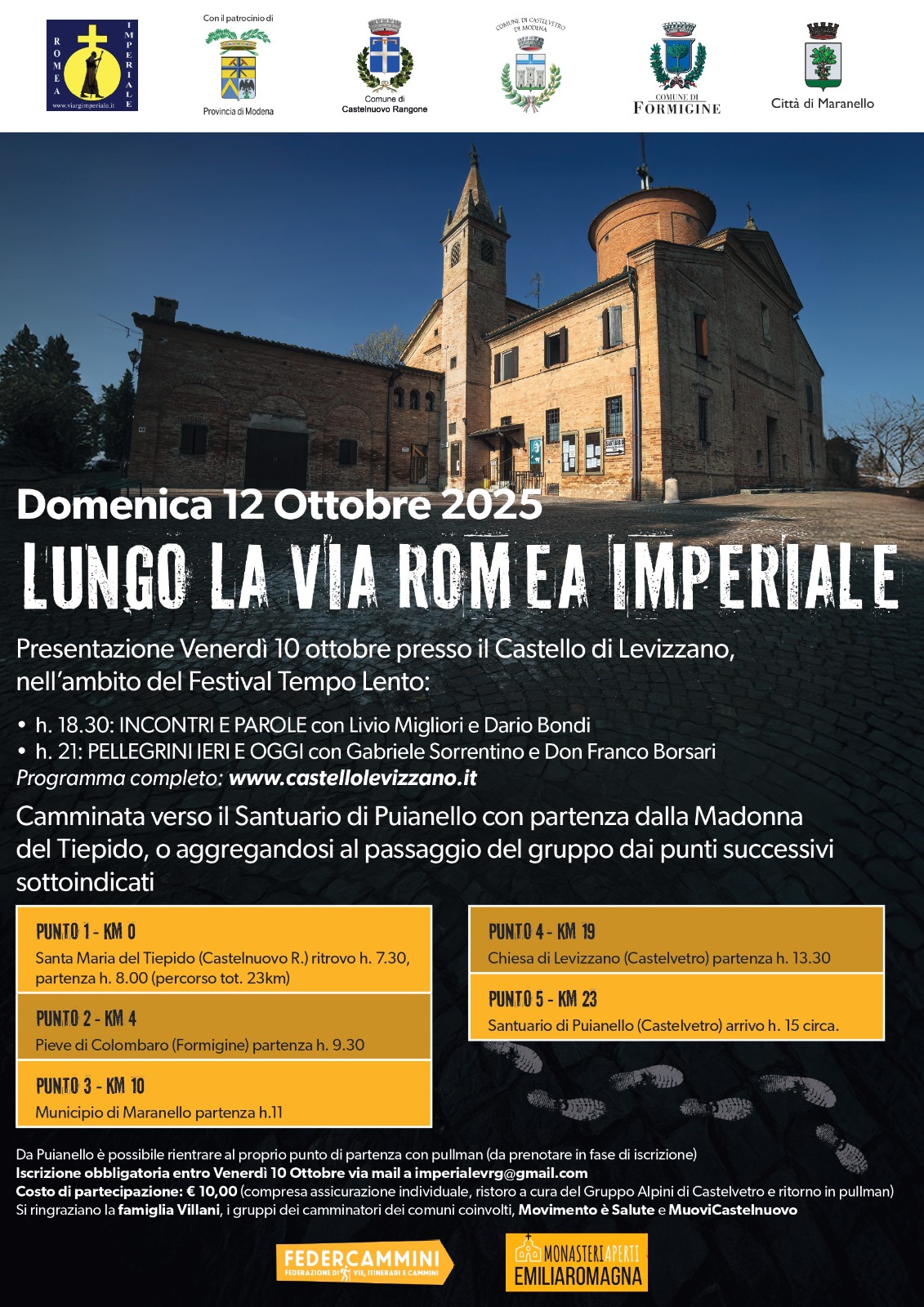 Venerdì 10 ottobre, nell’ambito della manifestazione “Tempo Lento” che da diversi anni si svolge a Levizzano di Castelvetro, si terranno due conferenze: nella prima, nel tardo pomeriggio, si avrà la presentazione dello stato di avanzamento del programma Via Romea Imperiale, la strada internazionale per ciclisti e camminatori, che dal Nord Europa arriva a Roma.